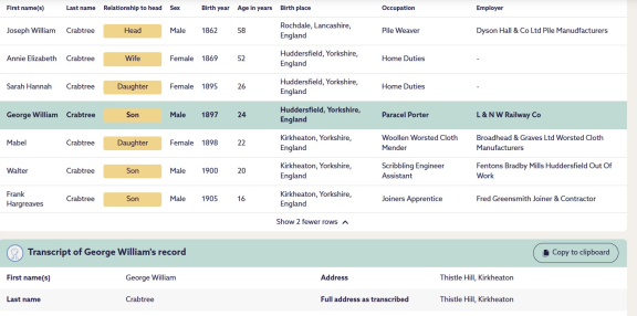 In 1921, George is still back living at home and on the census form his job is described as 'parcel porter', for the London and North West Railway Company, at Huddersfield Railway Station.