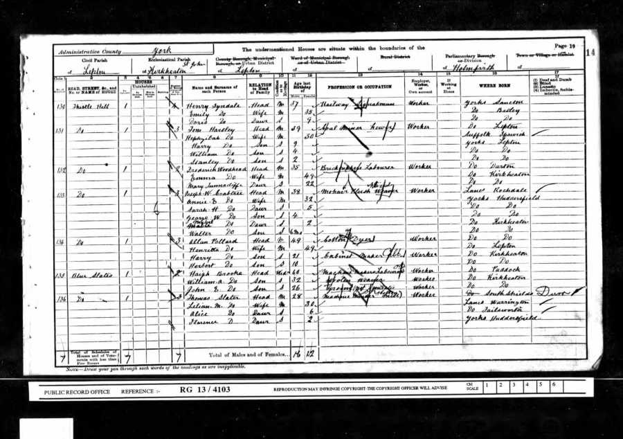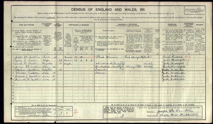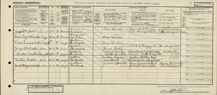 George was the second child of Joseph William and Annie E Crabtree. There were 6 children and George was the oldest of the 4 boys and the only one old enough for enlistment for war. They all grew up at Thistle Hill, Kirkheaton, Huddersfield. Census forms for 1901 and 1911 below.